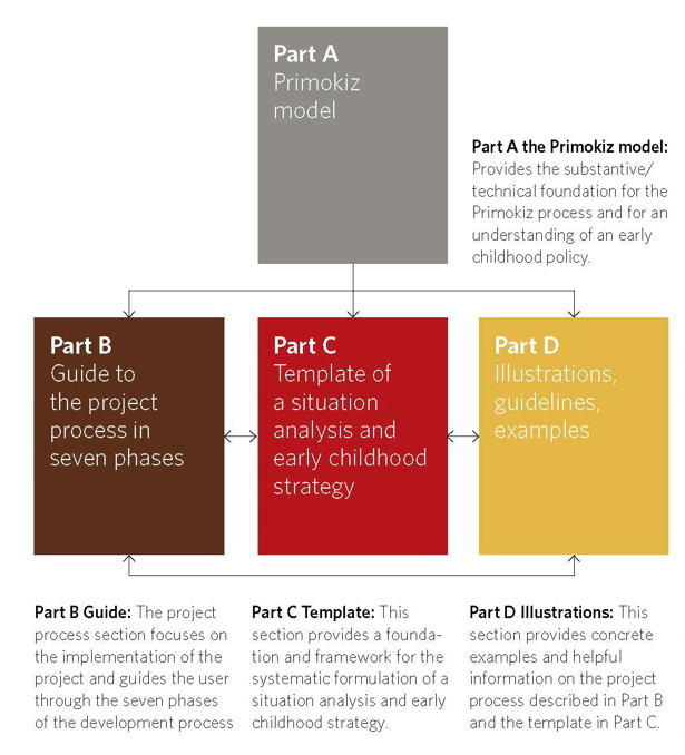 The methodology provides guidance for key steps in the process — the Primokiz Handbook and its resource package (tools for running a situation analysis, for drafting a strategy, for developing an implementation plan, samples of tools used in different countries, etc.), as well as expert advice on facilitation of the process.