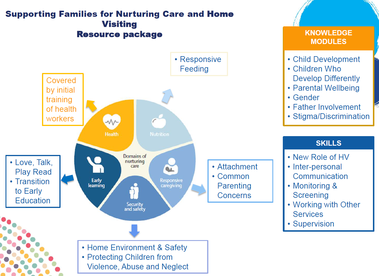 The modules are accompanied by supporting tools, urging the learner to actively engage in reflection and delivering guidance on the knowledge, skills, attitudes and practices required for home visitors in their new and enriched role.