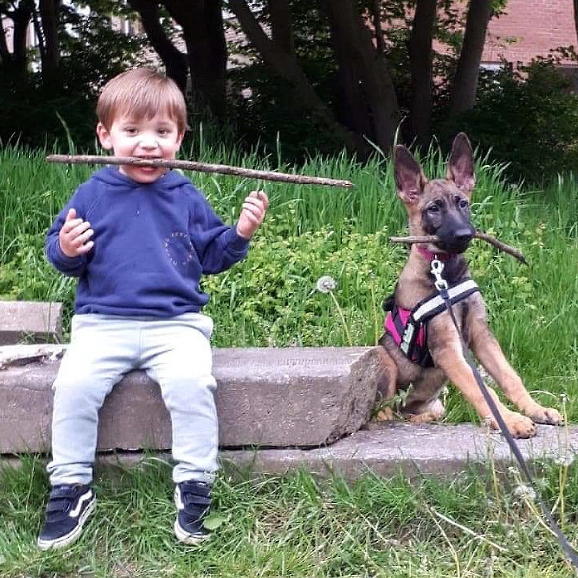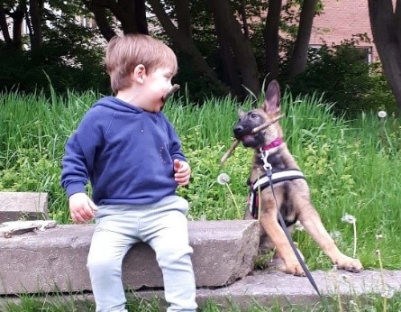 'Julian knows exactly what he wants. He is always ready to help. He likes to imitate the adults in their activities. Here he also imitates his dog. He is cheerful and has a great sense of humor.’