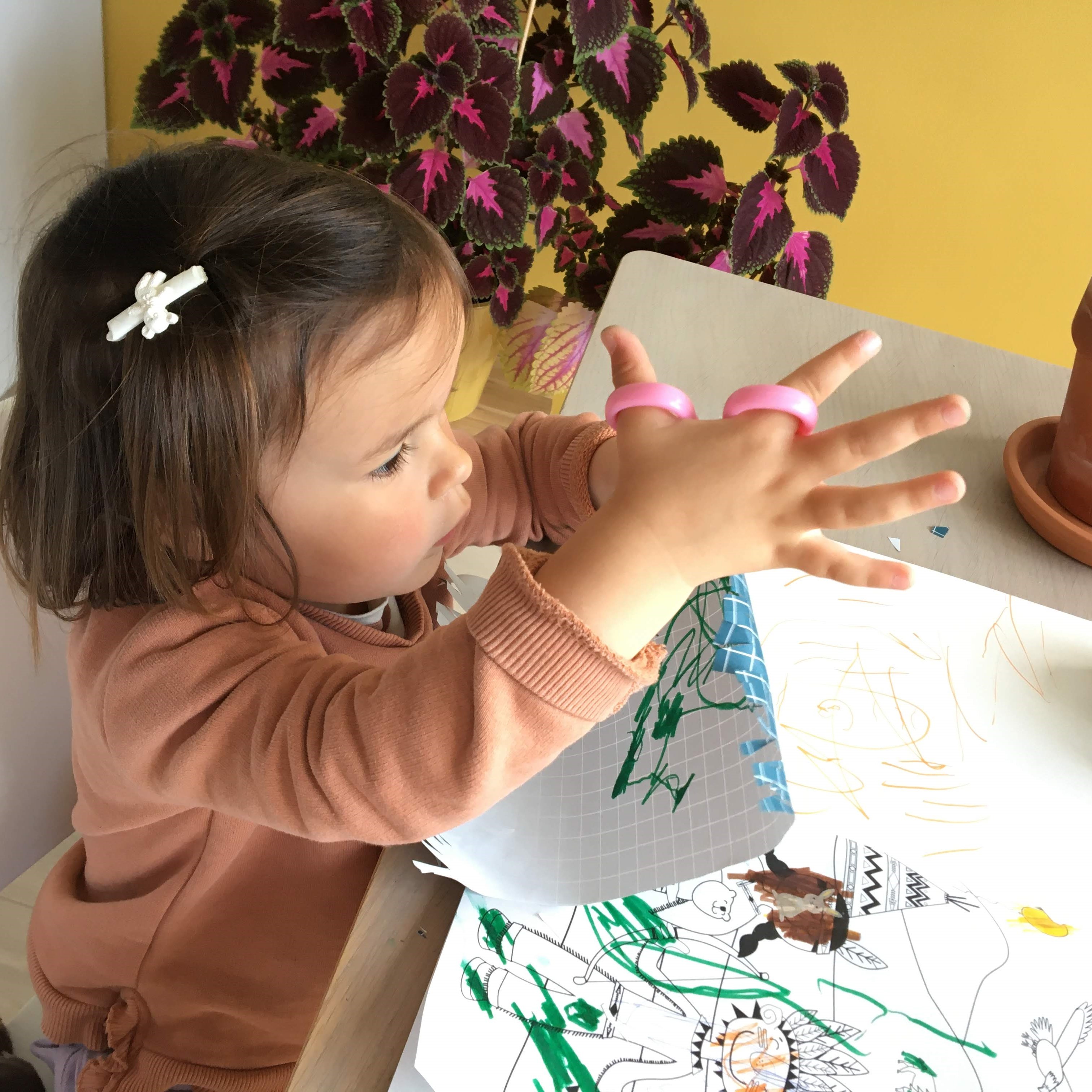 ‘A baby was born in our circle of friends. Together we made a card, because visiting was not possible. I cut letters from magazines, Mone drew but she soon became interested in the cutting and pasting. What a concentration. Since then I have had her cut every now and then’