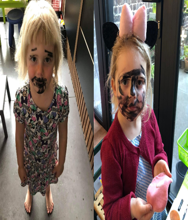 Childcare and kindergartens have a symbolic play corner in the children’ space or classroom. The corner is a symbolic representation of ‘real’ life, and is suitable for all kinds of pretend ‘as if’ play. But at home, that world is their reality. Children help with cooking, watering flowers, sweeping, and Lucas can even assist with office work. Imitation offers an opportunity to explore boundaries and apply rules flexibly. Matilda paints herself as dad: with a mustache and black eyebrows. She is just her dad.
