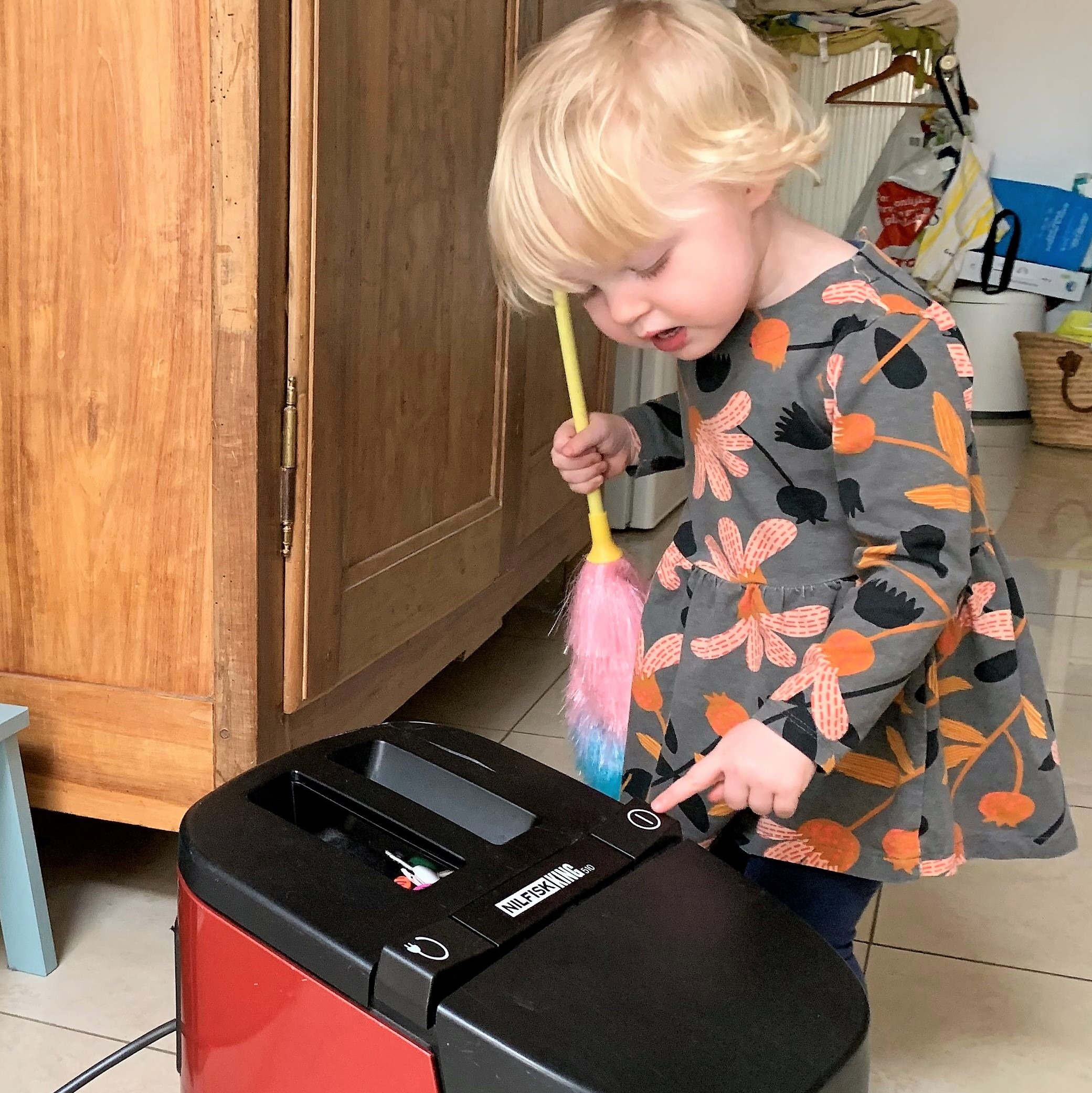 Matilda discovers the pleasure of brushing. She discovers the on and off button of the vacuum cleaner. But there are still buttons in the house. The keys of the piano are also fascinating and the cuddly toy is also enjoying them.’