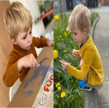 'My son Theo is constantly busy. He draws a lot of lines with sidewalk chalk, and then discovers all kinds of figures. He paints and enjoys cooking. During the nature walks he discovers everything and sometimes picks a dandelion.’