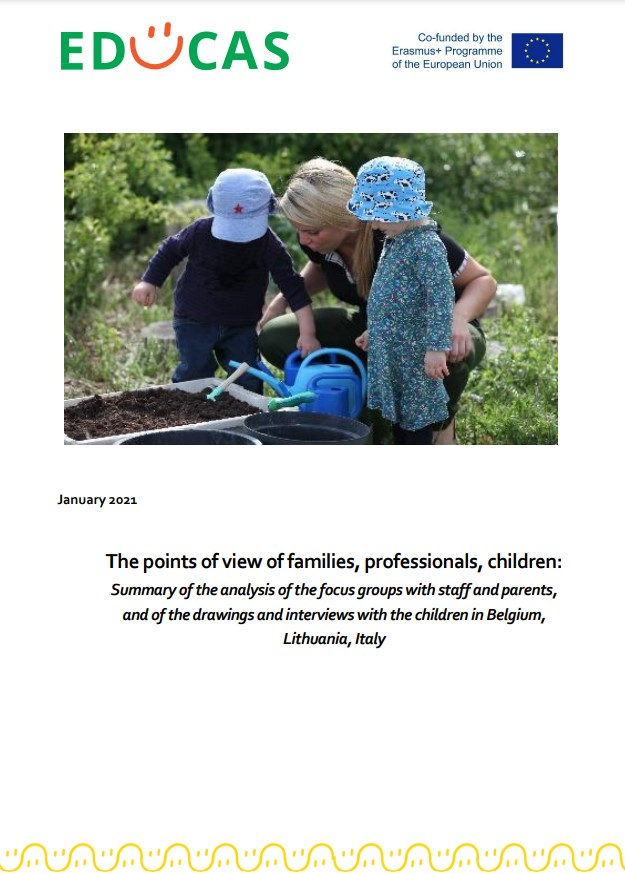 The report titled “The points of view of families, professionals, children” presents a summary of the analysis of the focus groups with staff and parents, and of the drawings and interviews with the children in Belgium, Lithuania, Italy.